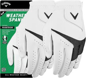 Callaway’s Weather Spann Glove offers a blend of synthetic leather and microfiber, providing durability and comfort. The moisture